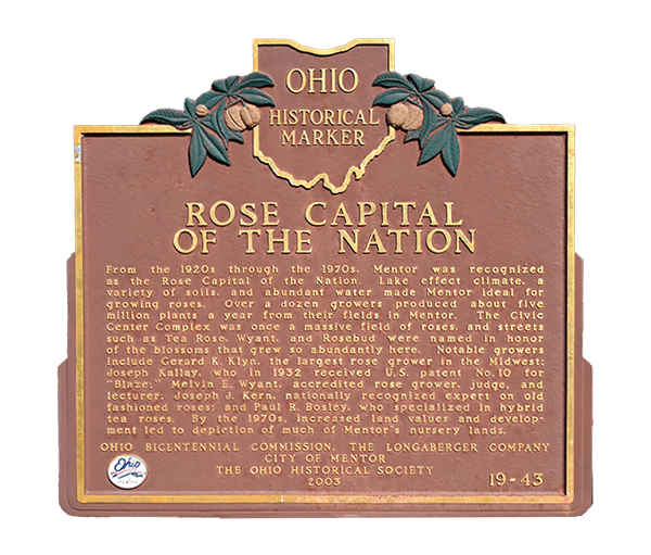 From the 1920s through the 1970s, Mentor was recognized as the Rose Capital of the Nation. Lake effect climate, a variety of soils, and abundant water made Mentor ideal for growing roses. Over a dozen growers produced about five million plants a year from their fields in Mentor. The Civic Center Complex was once a massive field of roses, and streets such as Tea Rose, Wyant, and Rosebud were named in honor of the blossoms that grew so abundantly here. Notable growers include Gerard K. Klyn, the largest rose grower in the Midwest; Joseph Kallay, who in 1932 received U.S. patent No. 10 for “Blaze;” Melvin E. Wyant, accredited rose grower, judge, and lecturer; Joseph J. Kern, nationally recognized expert on old fashioned roses; and Paul R. Bosley, who specialized in hybrid tea roses. By the 1970s, increased land values and development led to depletion of much of Mentor’s nursery lands. View the marker.