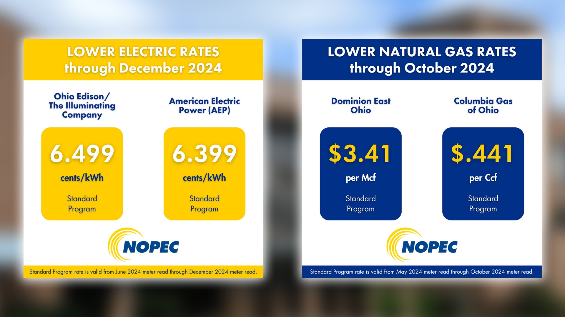 NOPEC has announced they will be lowering their electric and natural gas standard program prices. For more details, including information on NOPEC’s 12- and 24-month Fixed Term options and Monthly Variable Rate, call NOPEC’s Customer Care Center at 855-667-3201 or visit them online at nopec.org/checkrates.