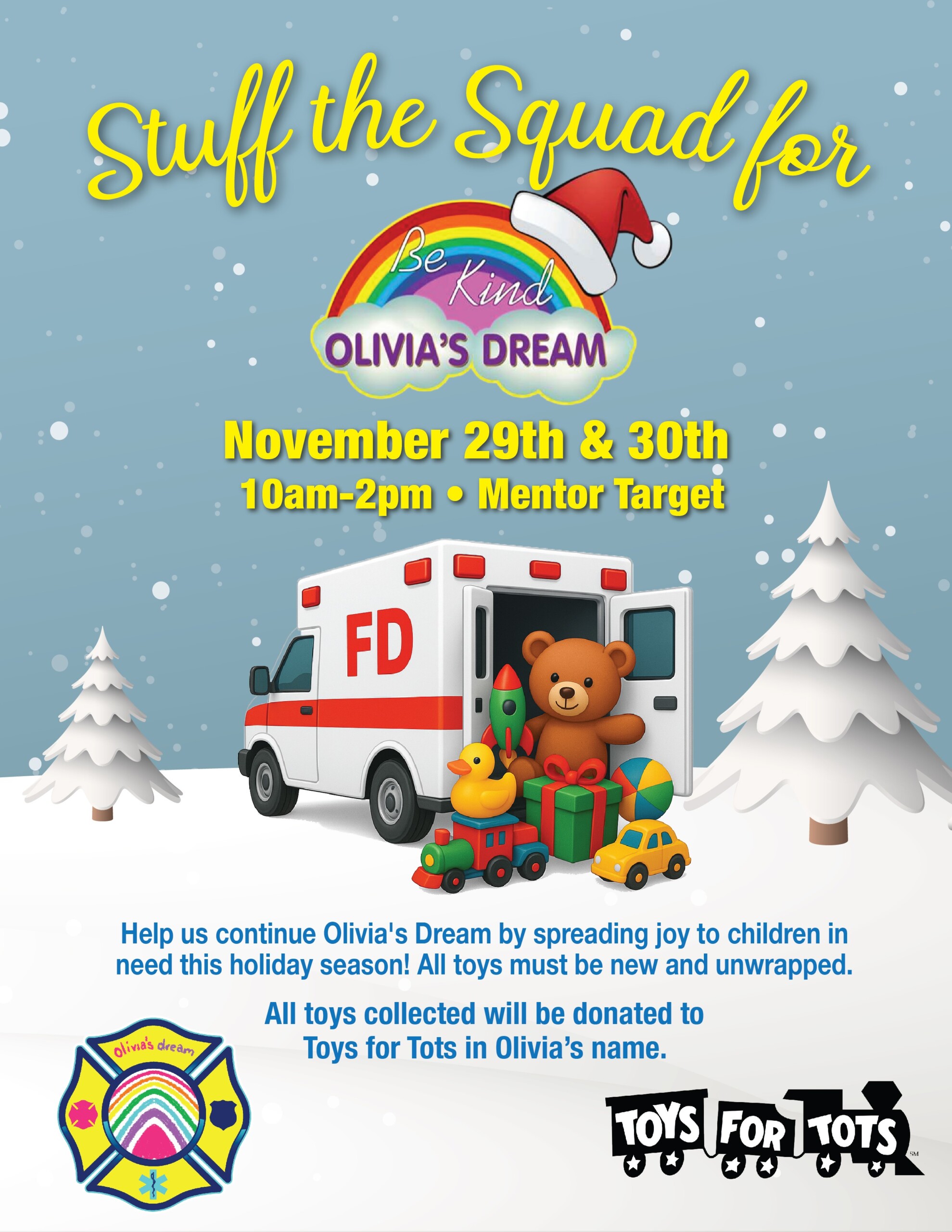 Help the Mentor Fire Department “Stuff the Squad” for Olivia’s Dream on November 29 and 30, 2025, from 10:00 AM – 2:00 PM at the Target store located at 9669 Mentor Avenue.