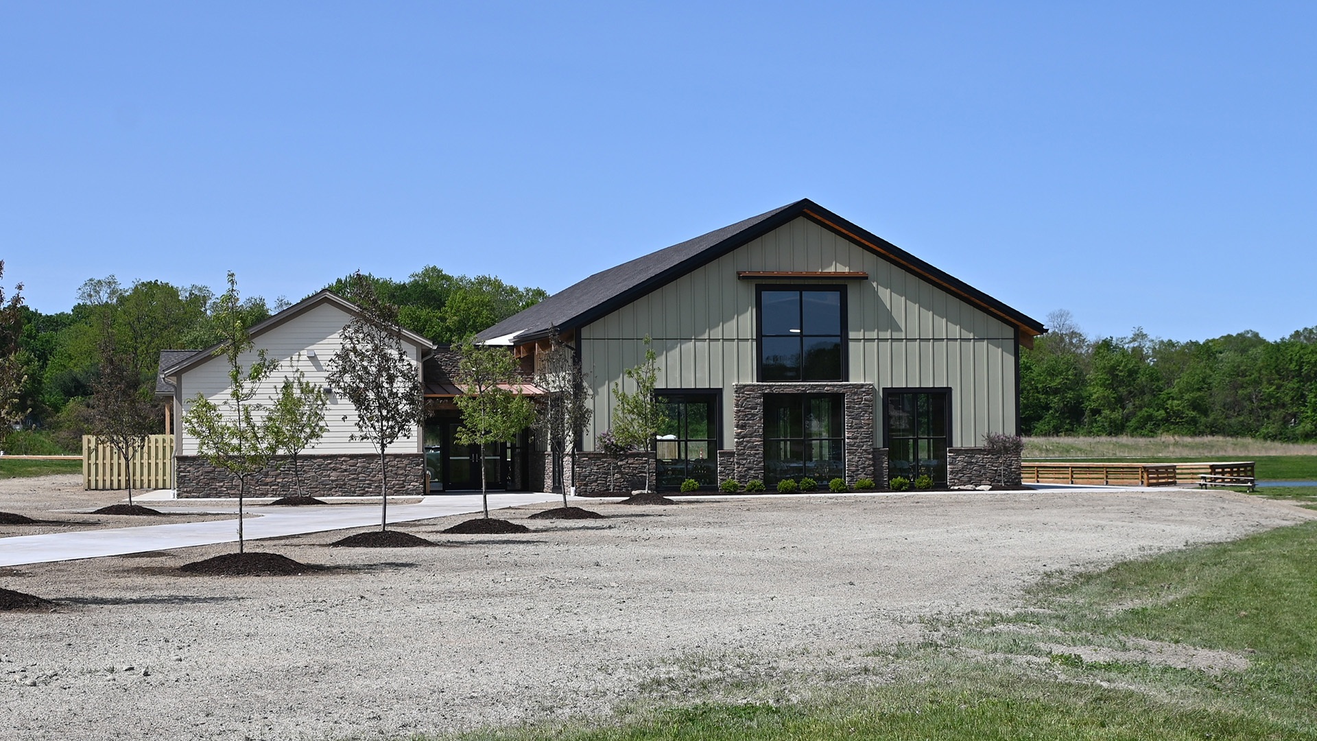 The much-awaited 4,400 SF facility features a main hall that is punctuated with dramatic timber trusses and a dominant fireplace faced with stone reclaimed from the former Sawyer House. Operable glass sectional panels on three sides of the hall allow access to the outdoor seating area. The building also features a warming kitchen as well as interior and exterior restrooms.